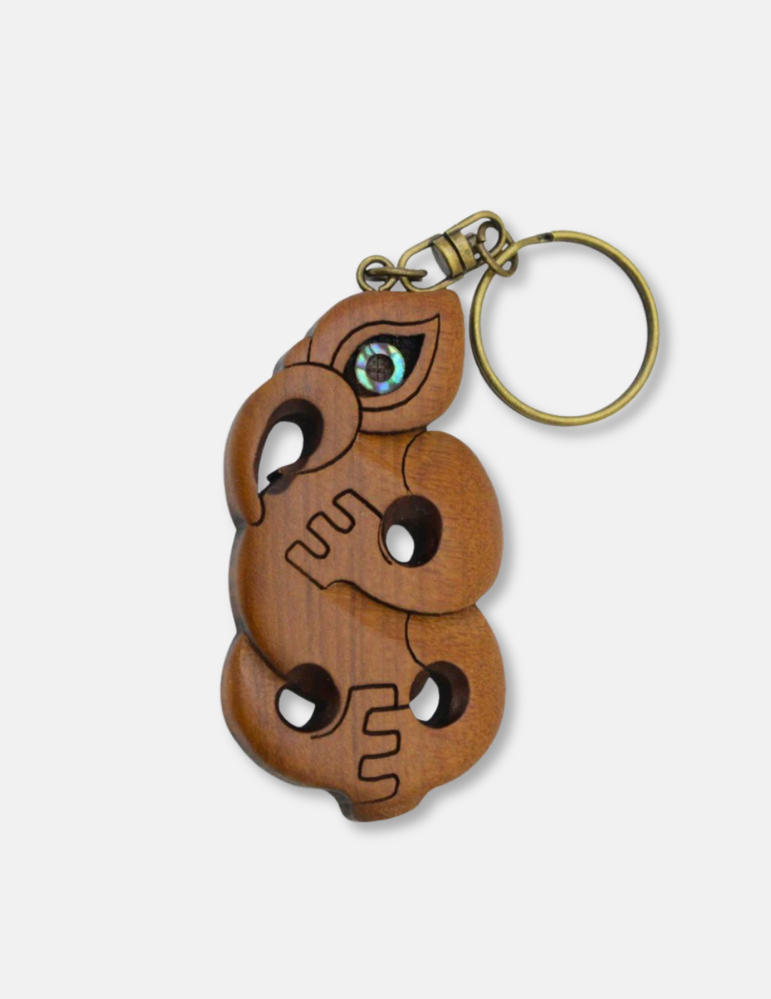Manaia keychain carved from 40,000 year old (est) Genesis Kauri with robust antique brass swivel keychain and embellished with Paua inlay