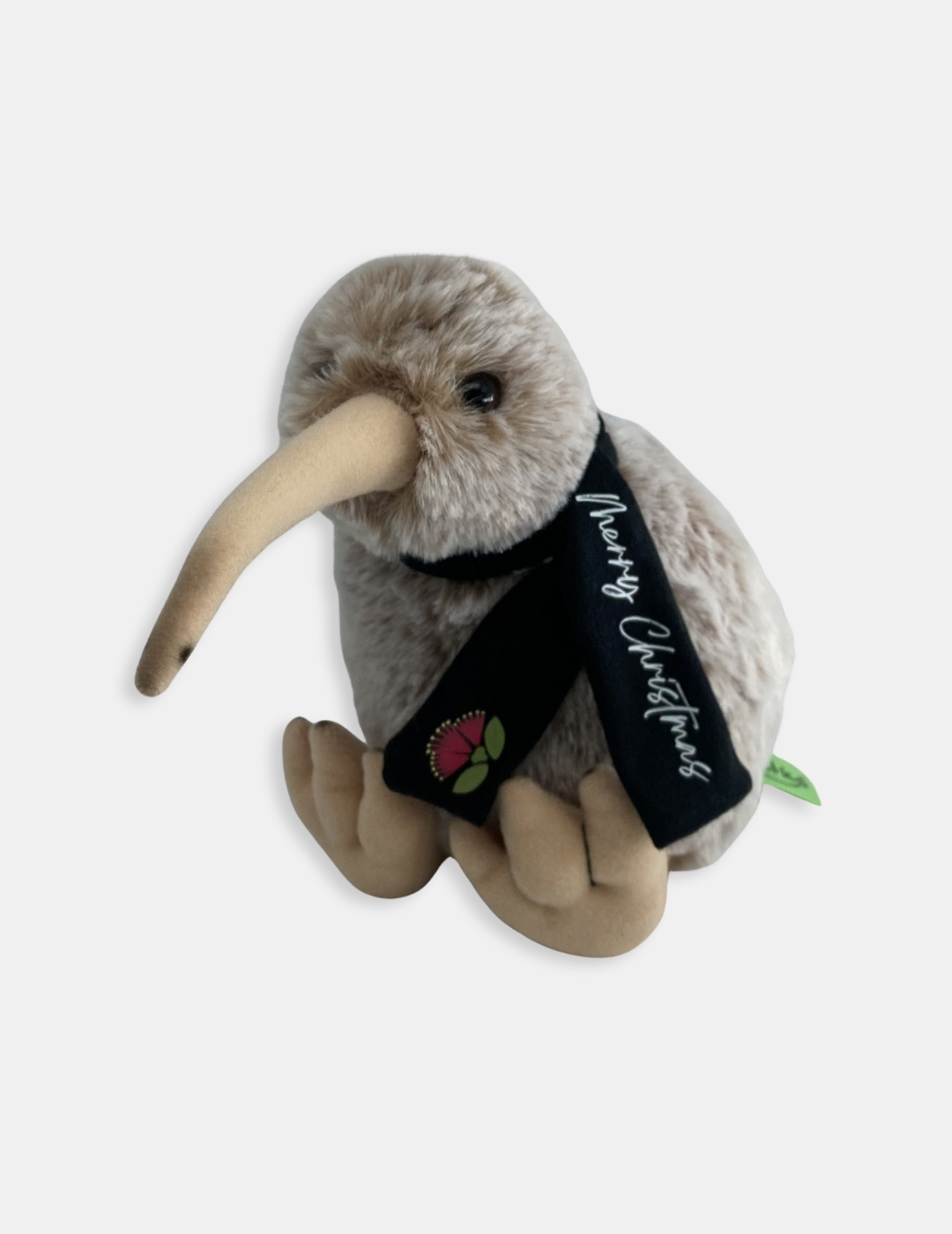 This Kiwi is extra soft and wears a merry Christmas scarf featuring a Pōhutukawa flower. The perfect gift for all the Kiwis out there!