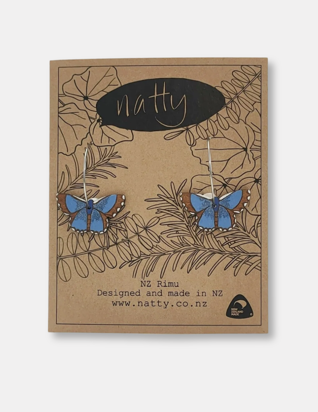 Show off your love for Aotearoas nature in style with these Blue Butterfly rimu earrings by Natty. The earrings are laser cut in our own design, hand painted.