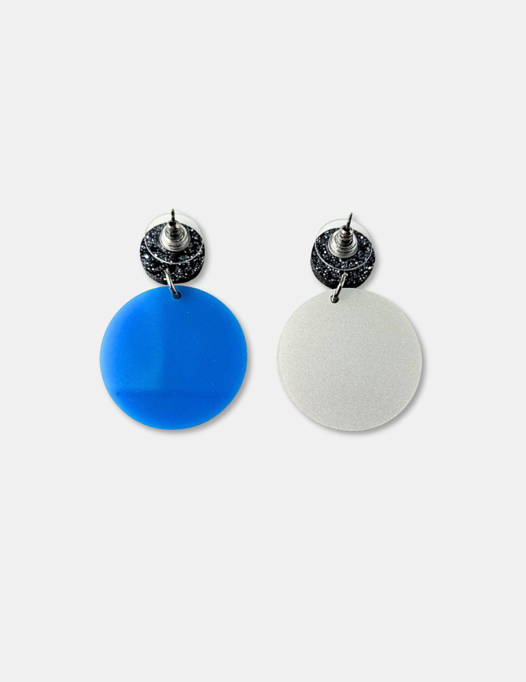 The Earth and Moon Asymmetrical earrings by Oh Pluto have been laser engraved and hand-painted in blue and pearlescent silver acrylics.