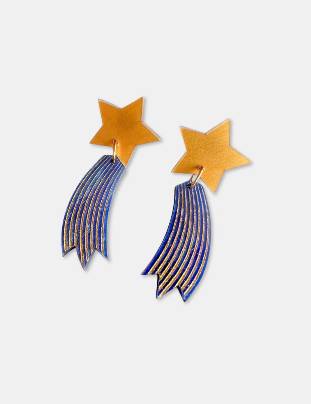 The dangling star trail is a 'Twilight' sparkle swirl acrylic with gold engraved and handpainted detail. The star trails hang from metallic gold acrylic stars. They are lightweight and simply stunning!
