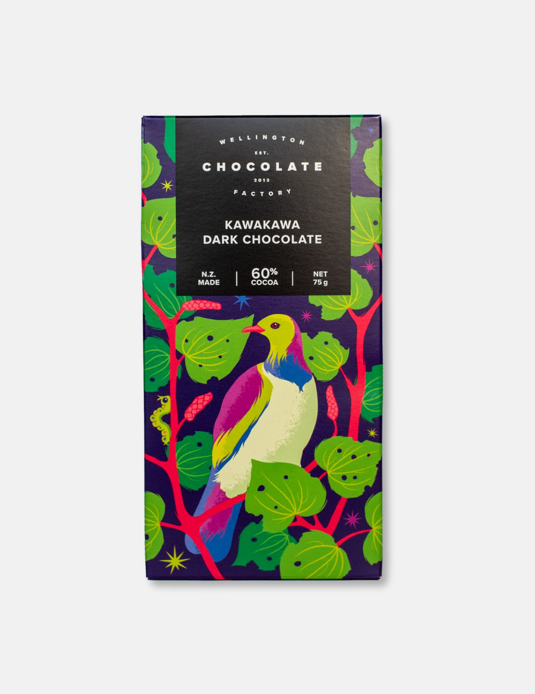 The distinct fresh and peppery flavours of Aotearoa's Kawakawa plant have been expertly paired with ethically-sourced Pacific cocoa for this dark 60% dark chocolate bar. The result is a wonderfully delicious bar with a taste unique to New Zealand, wrapped in gorgeous artwork from the gifted Nina Smith.