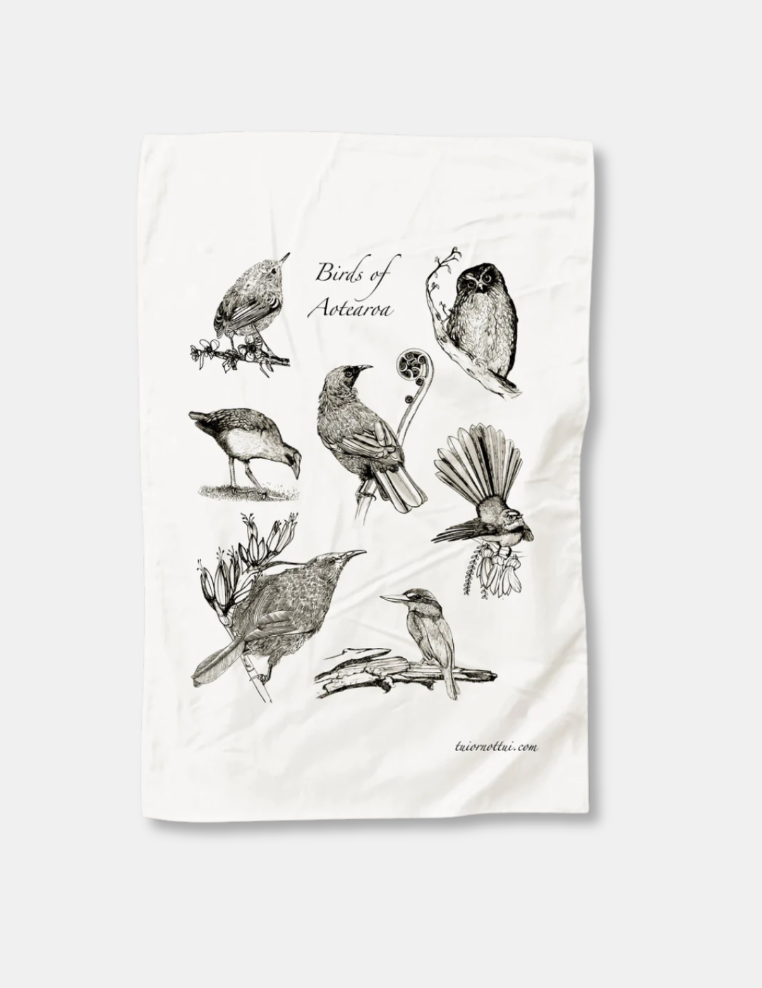 Brighten up your kitchen with this Birds of Aotearoa tea towel Designed by Jade Ell. This 100% cotton tea towel features images of iconic native birds the Tītipounamu, Ruru, Tūī, Pīwakawaka, Korimako, Kōtare, Pūkeko. Jade Ell is a Wellington-based artist who is inspired by the native wildlife in her local environment Eastbourne, where she lives with her son, Finn, and dog, Rita.